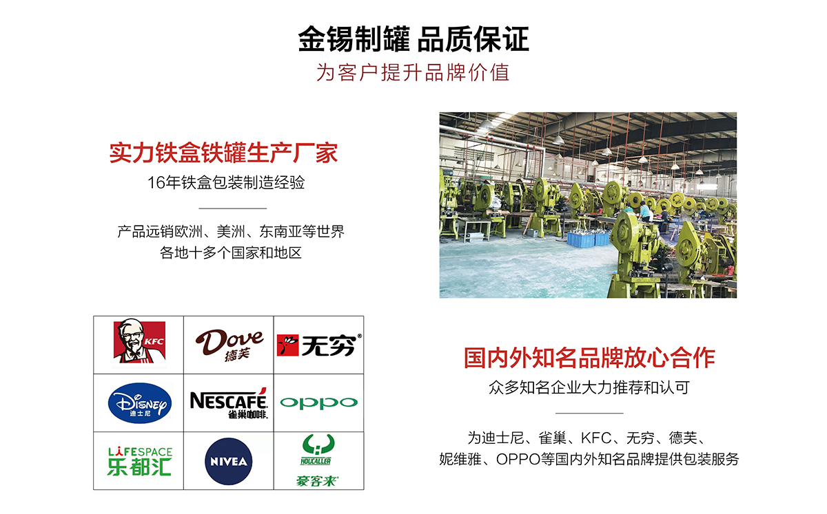 廣州市金錫五金制品有限公司成立于2016年,是已有13年生產(chǎn)經(jīng)驗(yàn)的實(shí)力廠家。我廠是專業(yè)定制優(yōu)良馬口鐵盒、鐵罐、禮品盒、茶葉罐、月餅盒等金屬鐵盒包裝的制罐企業(yè),我們擁有超過6000平方米的標(biāo)準(zhǔn)現(xiàn)代化廠房及八條生產(chǎn)線。公司集產(chǎn)品研發(fā)、設(shè)計、生產(chǎn)、銷售于一體,技術(shù)優(yōu)良,實(shí)力雄厚。通過十多年的制罐經(jīng)驗(yàn),我們擁有專業(yè)的技術(shù)團(tuán)隊(duì),嚴(yán)格的作業(yè)流程、完整的品質(zhì)保障體系、完善的銷售以及售后服務(wù)系統(tǒng)。